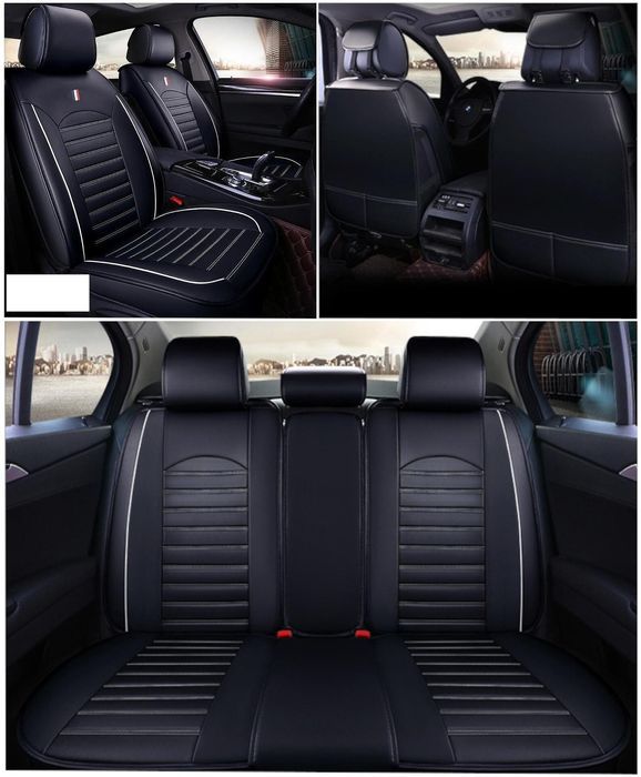 Луксозни кожени калъфи за седалки черни с бял кант , цял комплект клас