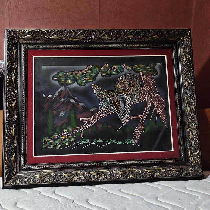 Голяма картина/ковьор рисуван върху текстил в масивна рамка и стъкло