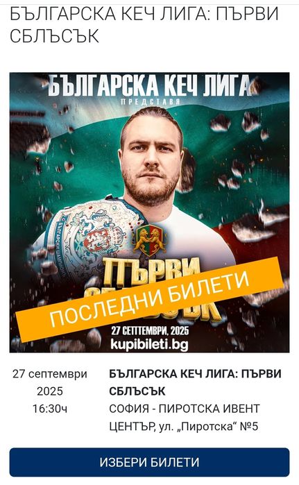 Продавам 4 билета за "БЪЛГАРСКА КЕЧ ЛИГА: ПЪРВИ СБЛЪСЪК" на 27.09.2025 - места правостоящи.