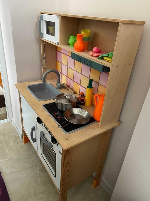 Детска кухня с включени аксесоари, отлично състояние. Закупена от Германия, размери ш 66 см х д 34 см х в 100 см. Намира се в град Велико Търново, възможно е изпращане с куриер при нужда.