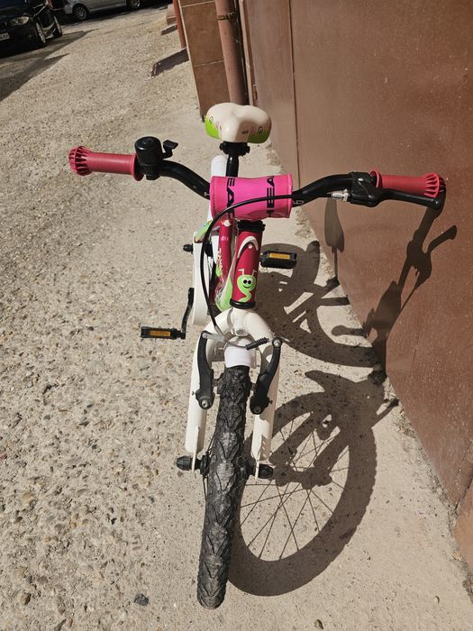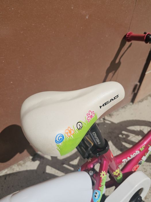 Детско колело Head, 16". Подходящо за момиче, цикламено с картинки. Има възможност за поставяне на помощни колела. Запазено, без нацепвания на седалката.