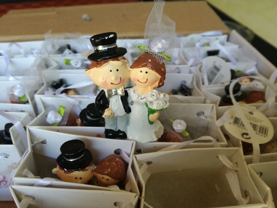 Продавам сватбени фигурки всяка самостоятелно опакована в малка подаръчна торбичка.Налични 44 броя.Цената е за брой. При покупка на всички фигурки цена по договаряне.