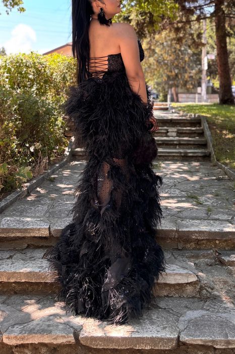 Бална рокля в цвят капучино и ръчно пришити камъни и пера