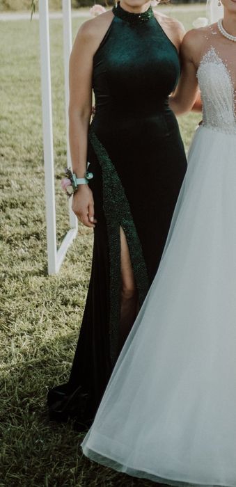 Официална, бутикова рокля в изумрудено зелено с камъни и дълбока цепка