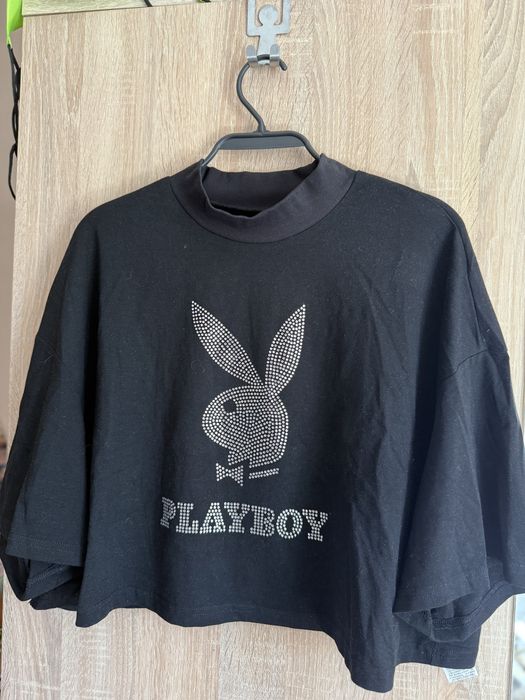 Crop top тениска с камъчета playboy, с щампа на гърба, бяла, черна