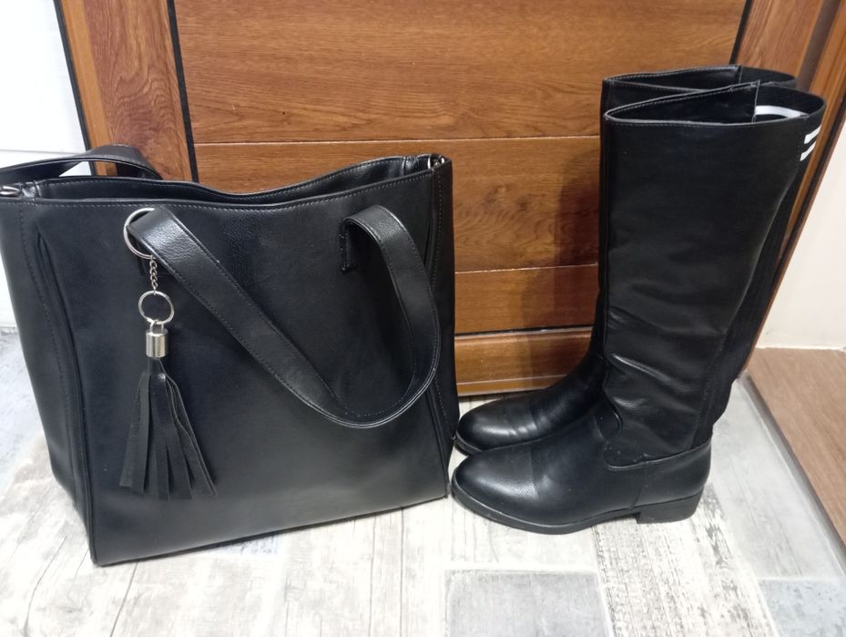 Високи ботуши черни и подарък чанта